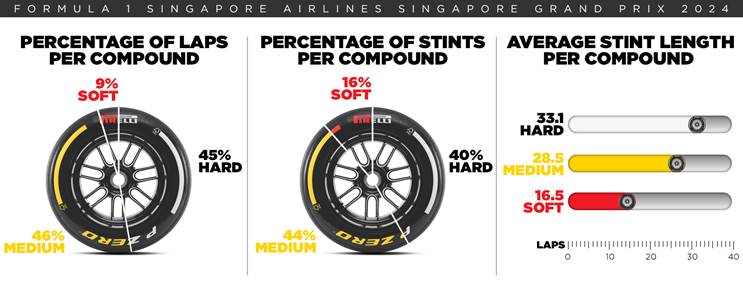 Pirelli nu a făcut nicio modificare față de anul trecut în ceea ce privește compozițiile slick pe circuitul Marina Bay, C3 fiind Hard, C4 Medium și C5 Soft. Deși există și C6, care este și mai moale, când au fost anunțați compușii pentru a doua parte a sezonului în timpul weekendului Marelui Premiu al Ungariei, evaluările efectuate înainte de pauza de vară au exclus cel mai moale pneu din gama 2025, deoarece forțele exercitate asupra pneurilor și temperaturile ridicate de la acest eveniment ar fi putut crea unele probleme de supraîncălzire. De fapt, în această cursă, stresul termic este principala cauză a degradării performanței pneurilor.
