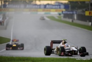 Sebastian Vettel l-a agatat sau a fost agatat din spate de Narain dupa ce l-a depasit pe acesta si inainte de a-l numi castravete necopt si idiot a fost surprins pe camerele de inregistrare de pe propria masina cum a aratat degetul mijlociu catre pilotul indian.